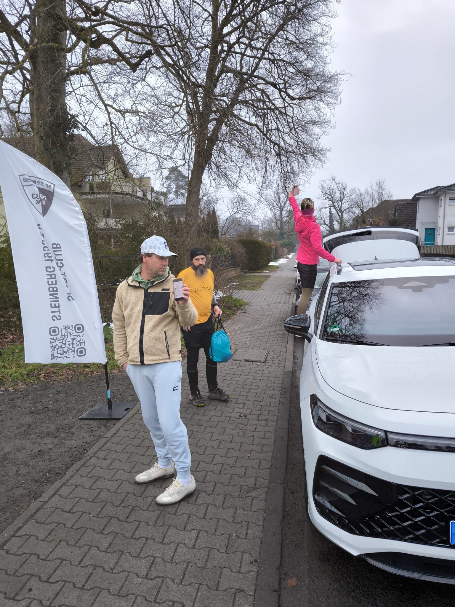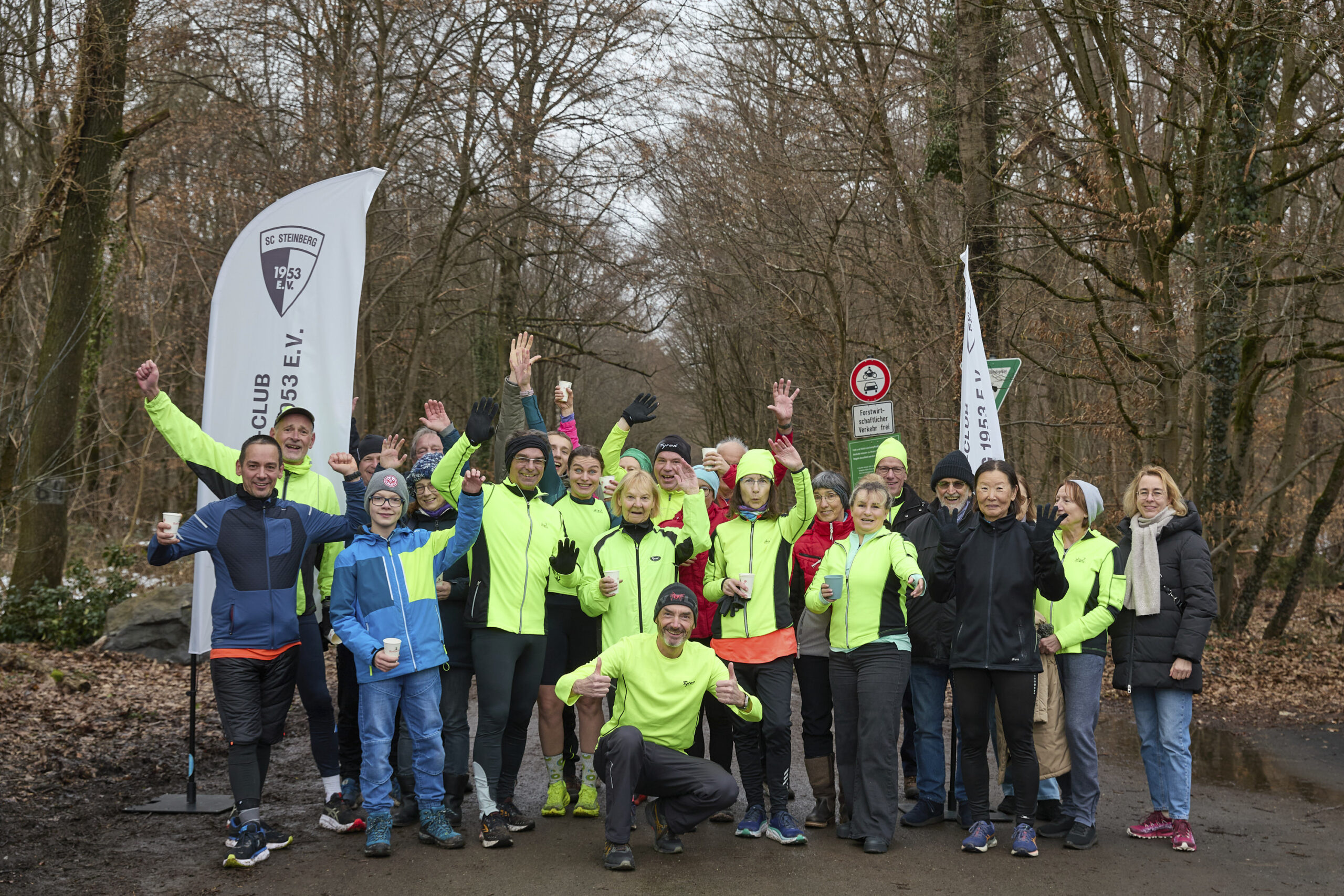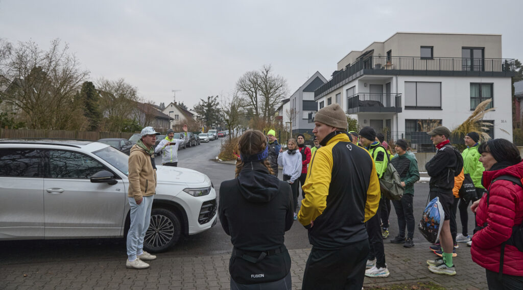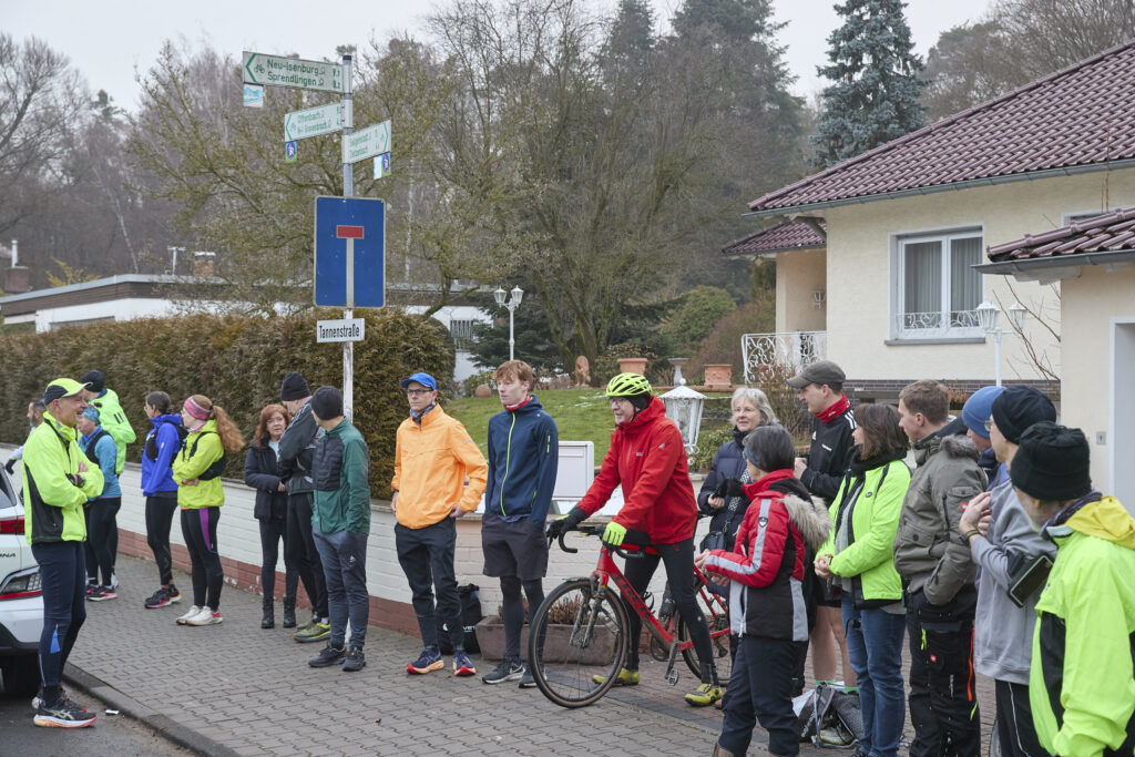 Am nächsten Morgen war dann Treffpunkt in der Tannenstraße für den 246. Marathon. Weil Sonntag war, hatten wohl sehr viele aus der Region und von weiter weg Lust und Zeit Joyce zu begleiten. Auch 7 Tapfere vom SC Steinberg waren dabei. Als Joyce und ihr Partner pünktlich um 9:00 Uhr eintrafen, waren sie von der Resonanz sichtlich überrascht. Ihr Partner, den sie kokettierend stets als Praktikant bezeichnet, übernahm etwas apathisch die Einweisung des Teilnehmerkreises. Auch wenn Joyce die Anwesenheit unseres Bürgermeisters wenig Bedeutung schenkte, übernahm er souverän die Begrüßung und die Verabschiedung der Läufer.