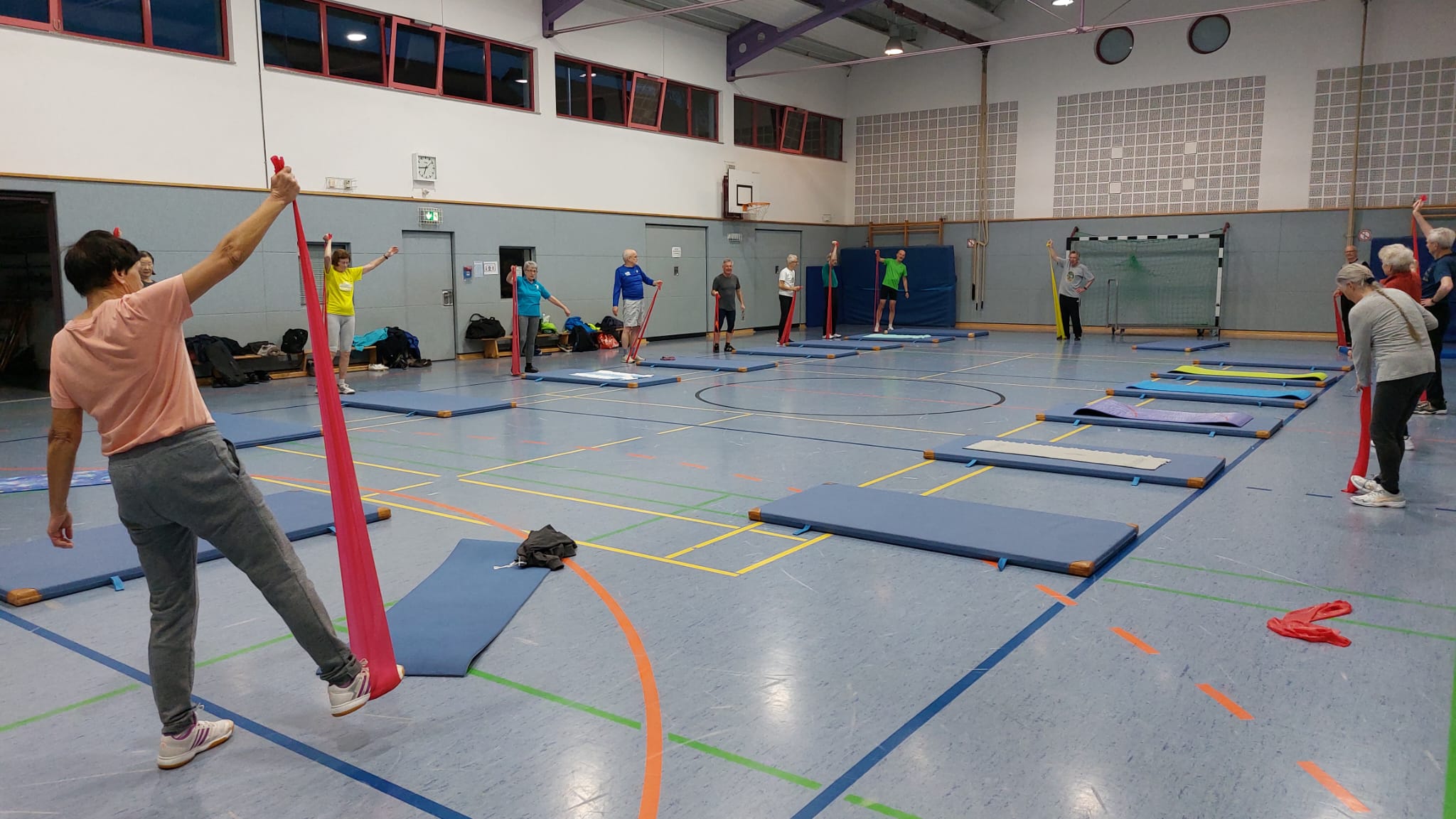 In der großen Halle gibt es noch etwas Platz und Übungsmatten für Neueinsteiger. Interessierte sollten nicht zögern und einfach mal mitmachen. Für ein kurzweiliges effektives Training werden übrigens auch Thera Bänder von unserer Abteilung gestellt.