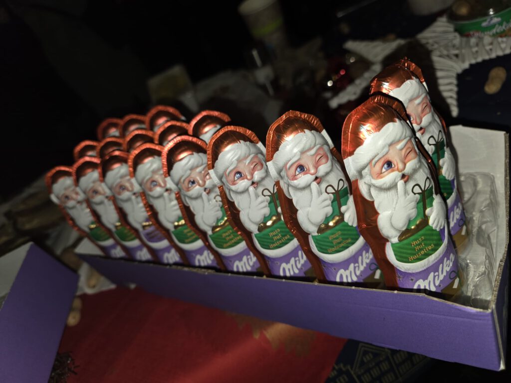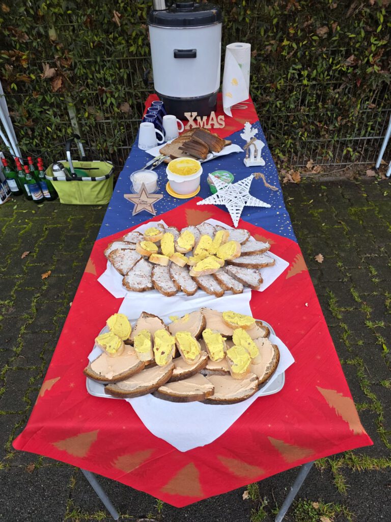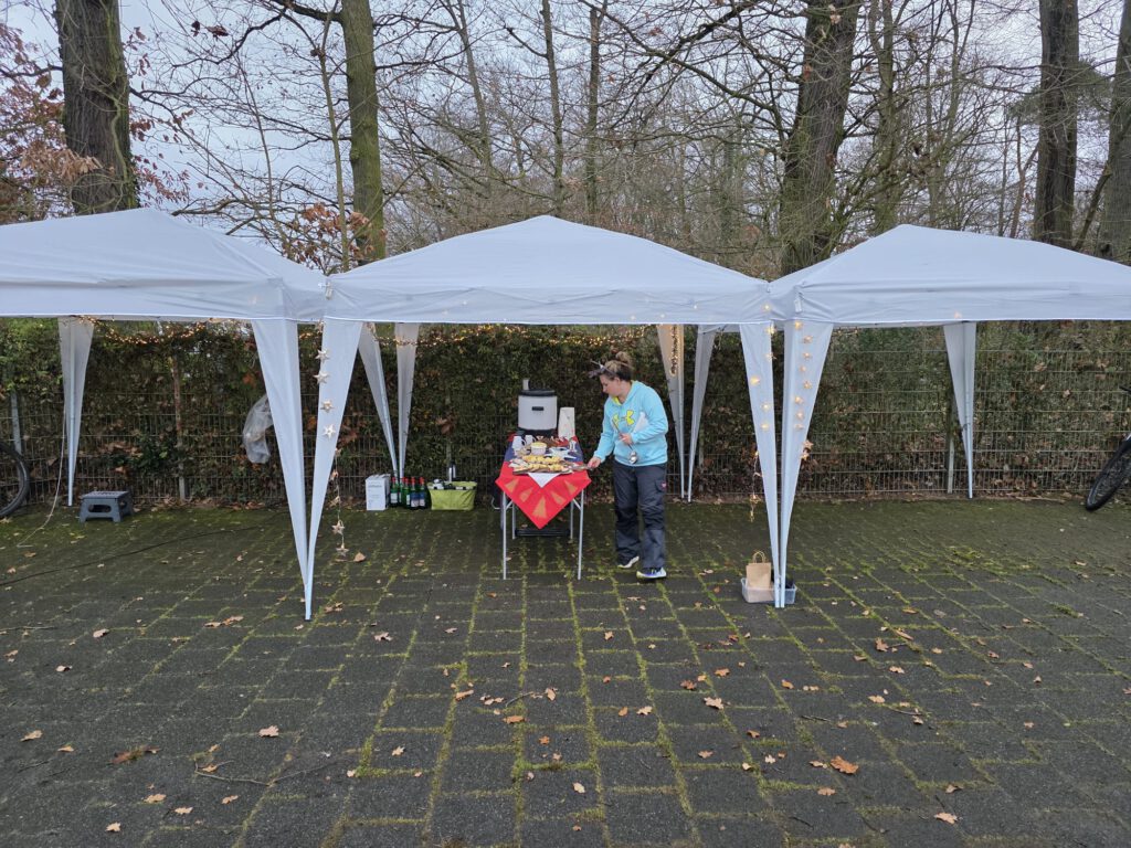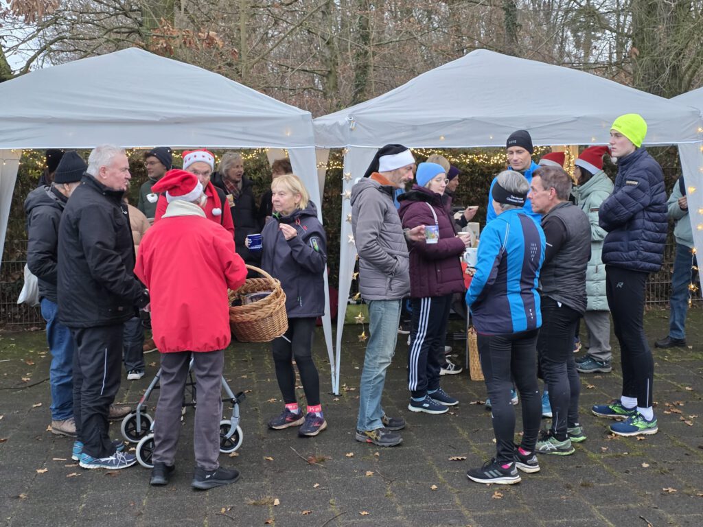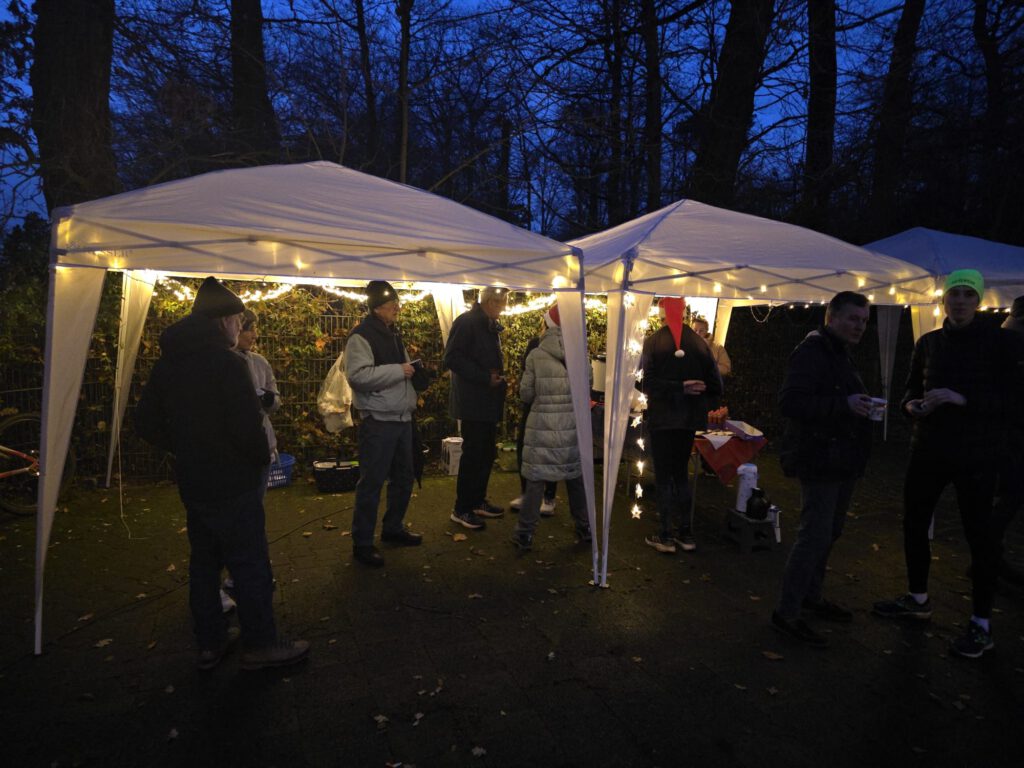 Im Anschluss an den sportlichen Teil wurde am Lauftreff-Treffpunkt (Wendehammer Heinrich-Mann-Schule) gefeiert. Unter Pavillons herrlich angerichtet, erwartete die Sportler ein Buffet mit Glühwein, Tee, Bauernbrot mit leckeren Aufstrichen und Weihnachtsgebäck. Jeder Teilnehmer bekam auch einen Schokoladen-Nikolaus geschenkt.